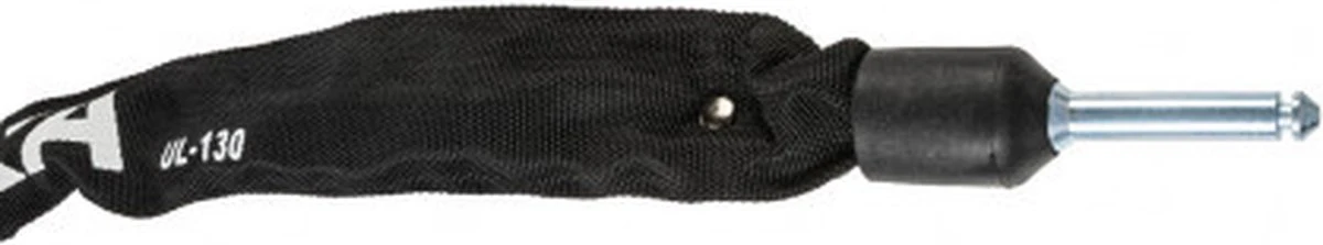De diameter van de schakels is 5,5 mm en de gehard stalen plug-in pin is 10 mm dik. Hij heeft een lengte van 130 cm en heeft een zwarte polyester hoes om de fiets te beschermen tegen krassen.