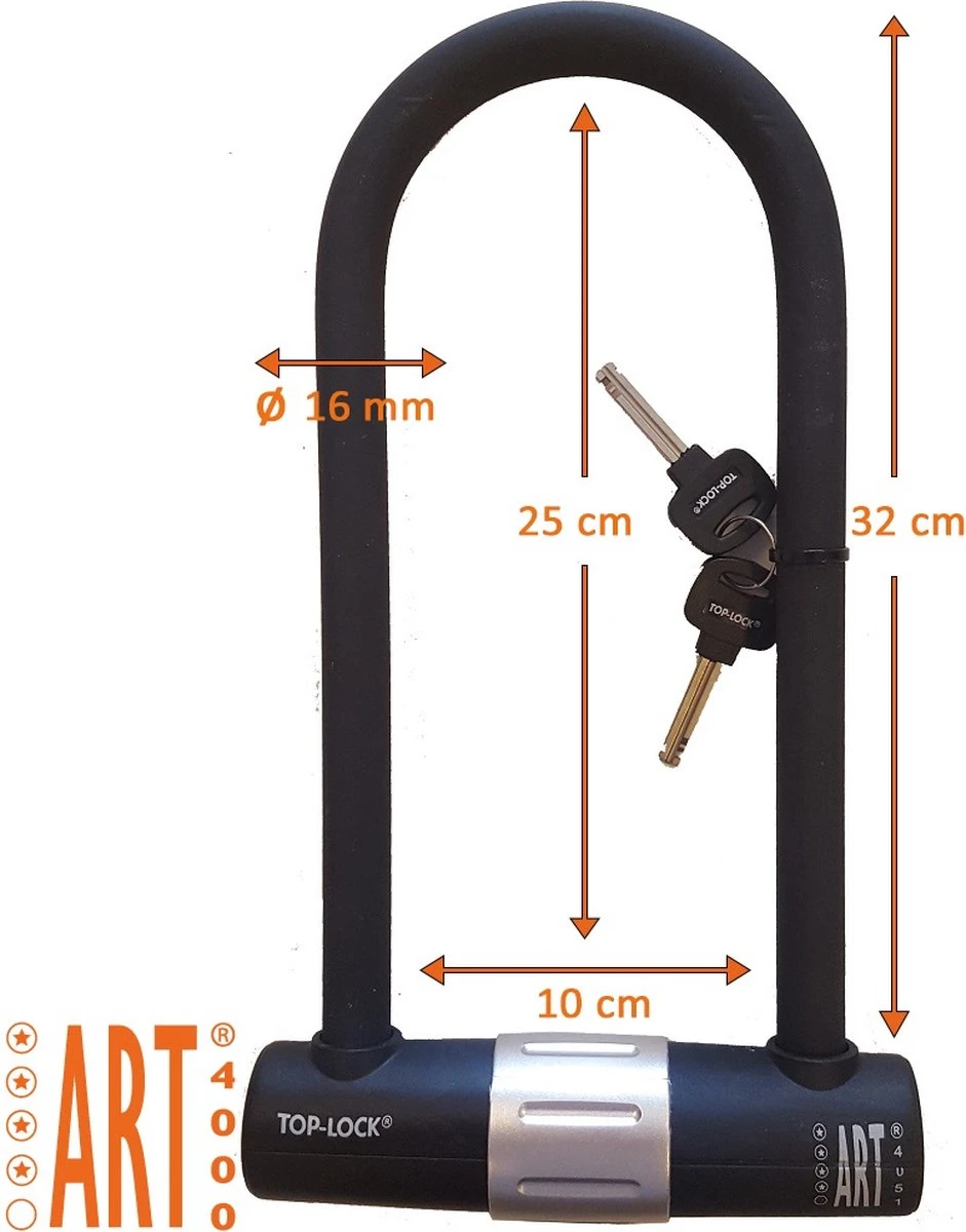 Je zoekt een compact en kwalitatief beveiligingsmiddel voor de scooter, motor of fiets? Dit Beugelslot van Top-Lock is voorzien van een ART 4 goedkeuring en hierdoor perfect voor de beveiliging van alle tweewielers. Dankzij het ART 4 sterren keuring kan het slot gebruikt worden om de tweewieler tegen diefstal te verzekeren. Dit geldt voor zowel de motorfiets als voor de scooter. Vanwege het geringe gewicht ten opzichte van andere fietssloten ook uitermate geschikt op de fiets mee op slot te zetten.
