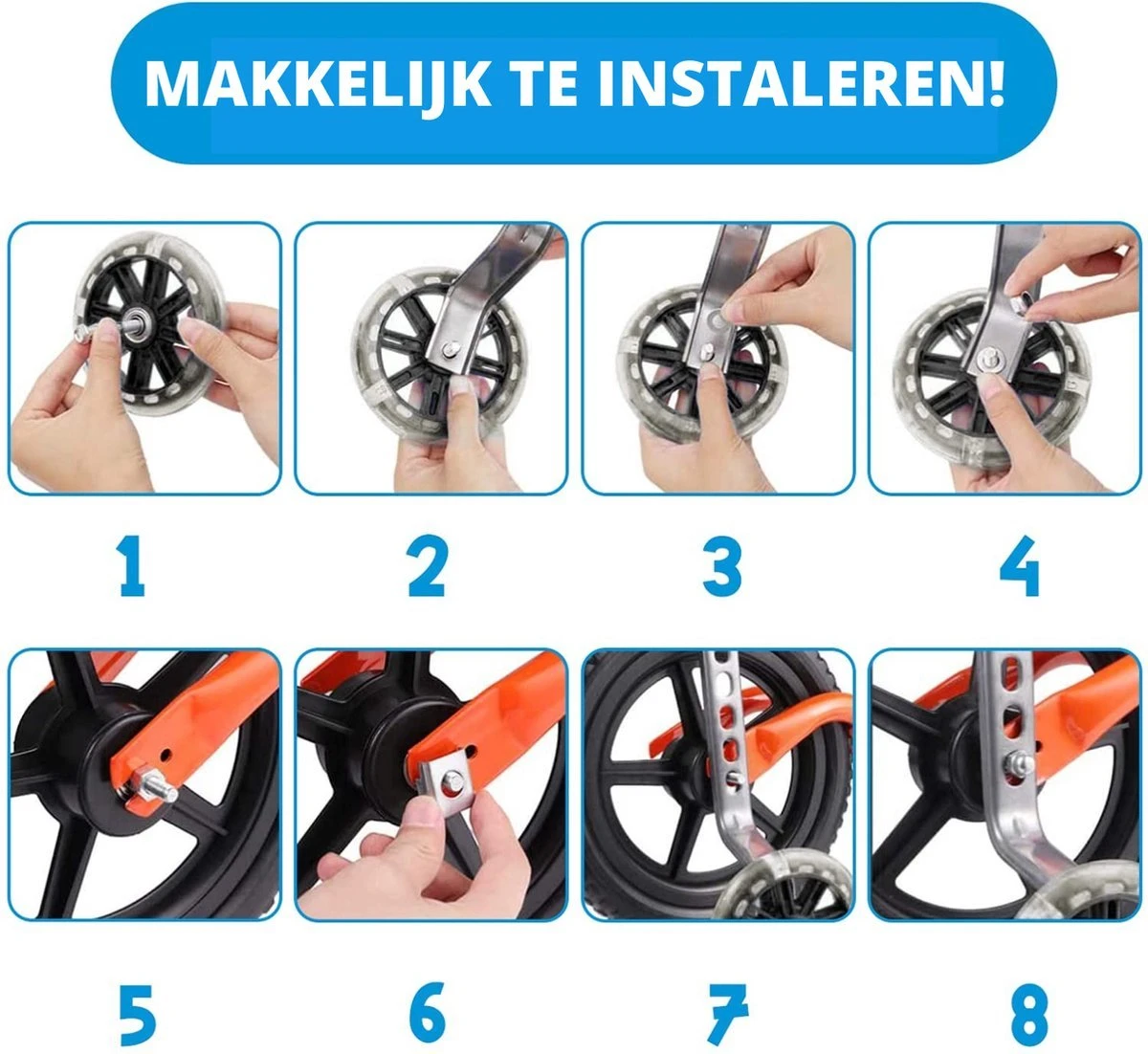 - [Gekwalificeerd materiaal] – onze steunwielen bestaan uit hoogwaardige, robuuste materialen en sterke metalen steunen om extra stabiliteit en veiligheid te garanderen en de veiligheid van kinderen te garanderen.