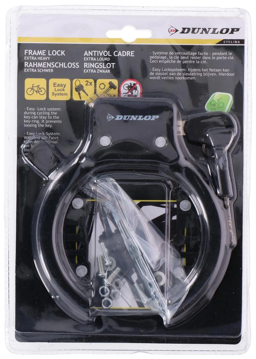 Dit ringslot fiets Dunlop is een slot dat op elke fiets past. Hij is makkelijk te monteren, de onderdelen om het slot te monteren worden ook bijgeleverd. Bij het slot worden ook 2 sleutels geleverd, waardoor je altijd een reserve sleutel hebt. Het slot is makkelijk open en dicht te maken. Het slot is van het goede merk Dunlop en heeft een formaat van 2 x 13 x 15 centimeter.