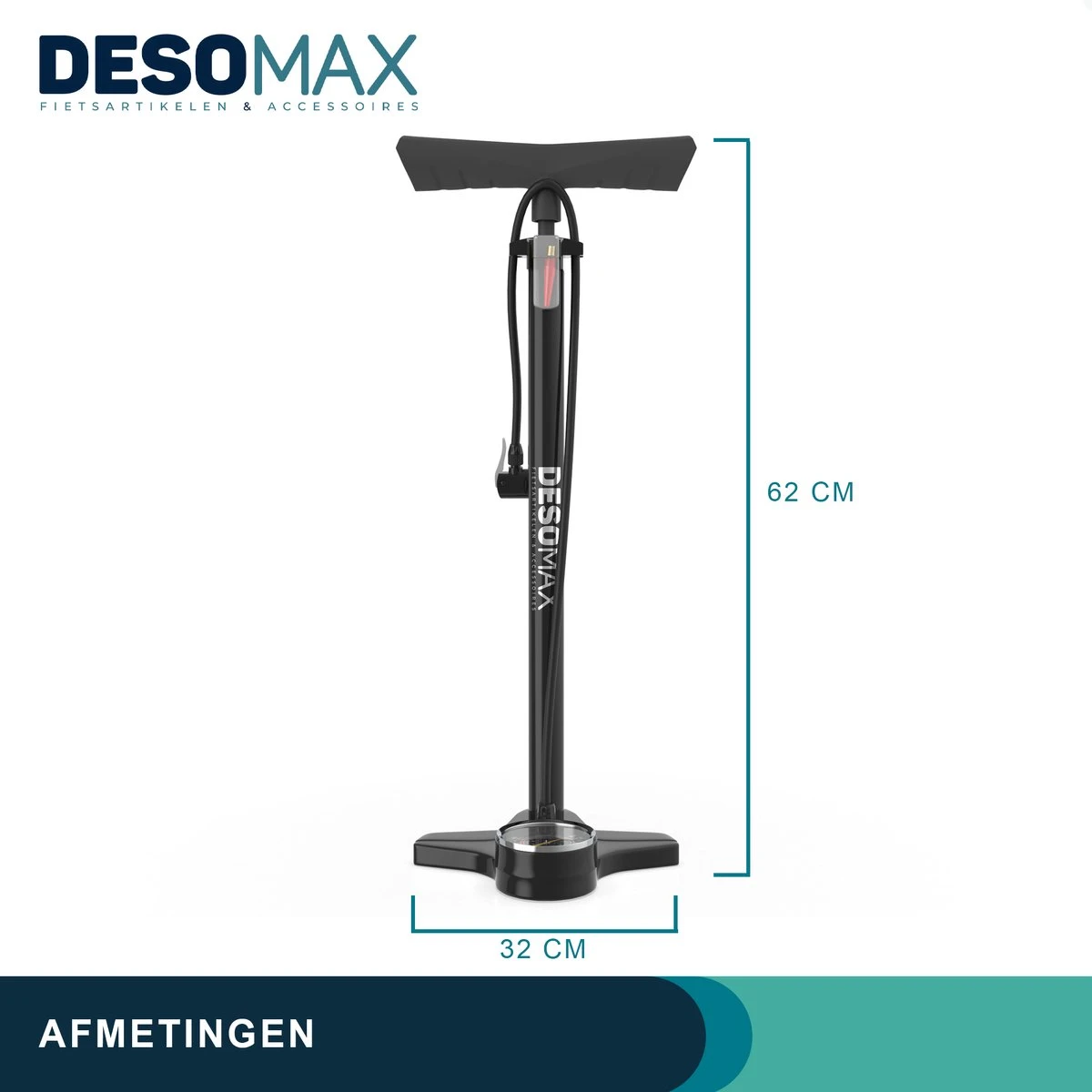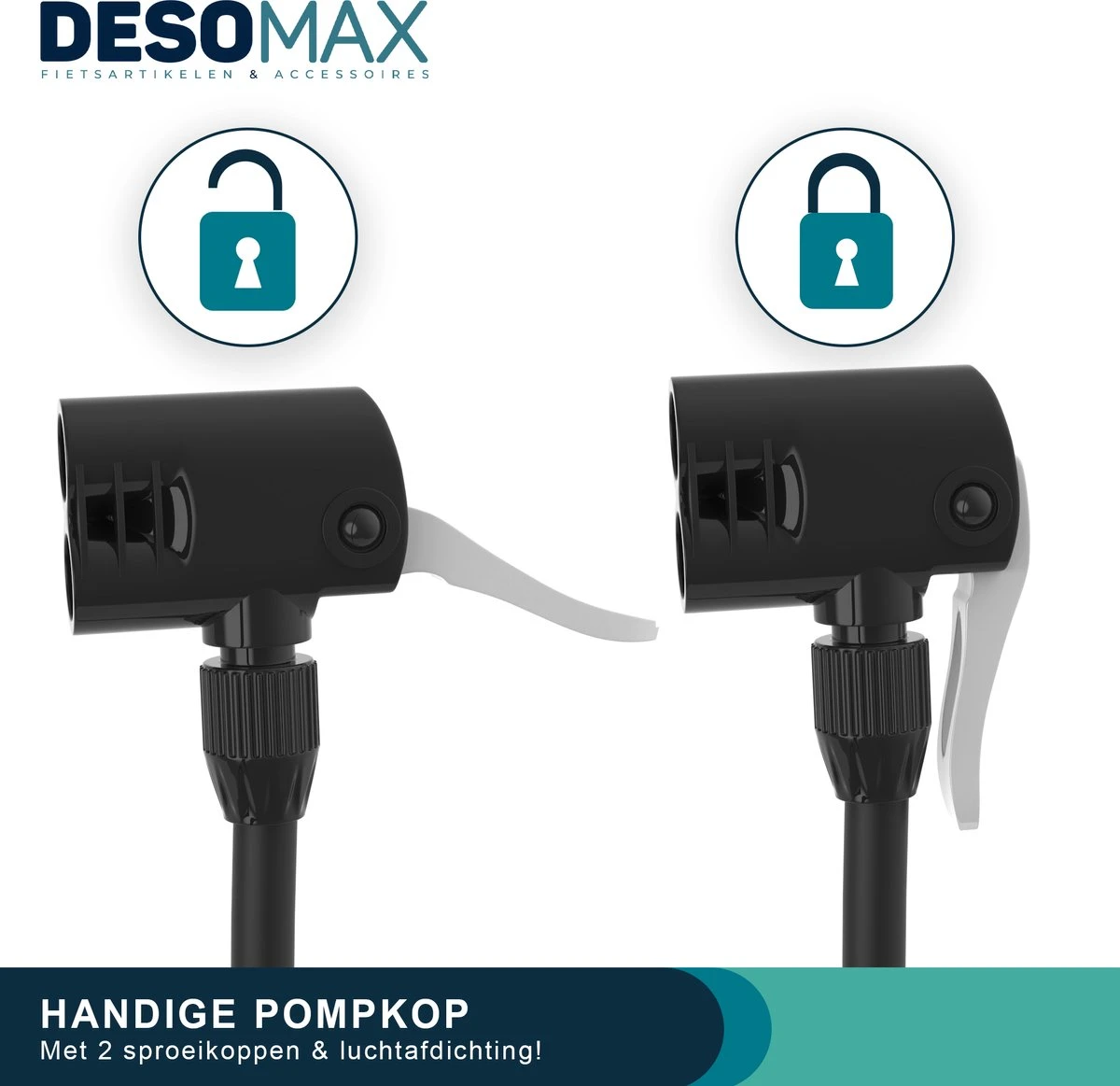 Als je geen zin hebt, om met ongemakkelijk fietspompen te werken, dan is deze DesoMax fiets luchtpomp met drukmeter de juiste keuze voor jou. Hiermee bespaar je veel tijd, of je er nu je fiets, racefiets, of mountainbike wiel mee wilt oppompen. Na gebruik hang je de lucht slang gewoon in de houder om hem weer snel op te bergen. De dubbele ventielkop is voor alle ventielen geschikt. Om meer te weten over de druk, dan is het genoeg om op de analoge manometer te kijken.