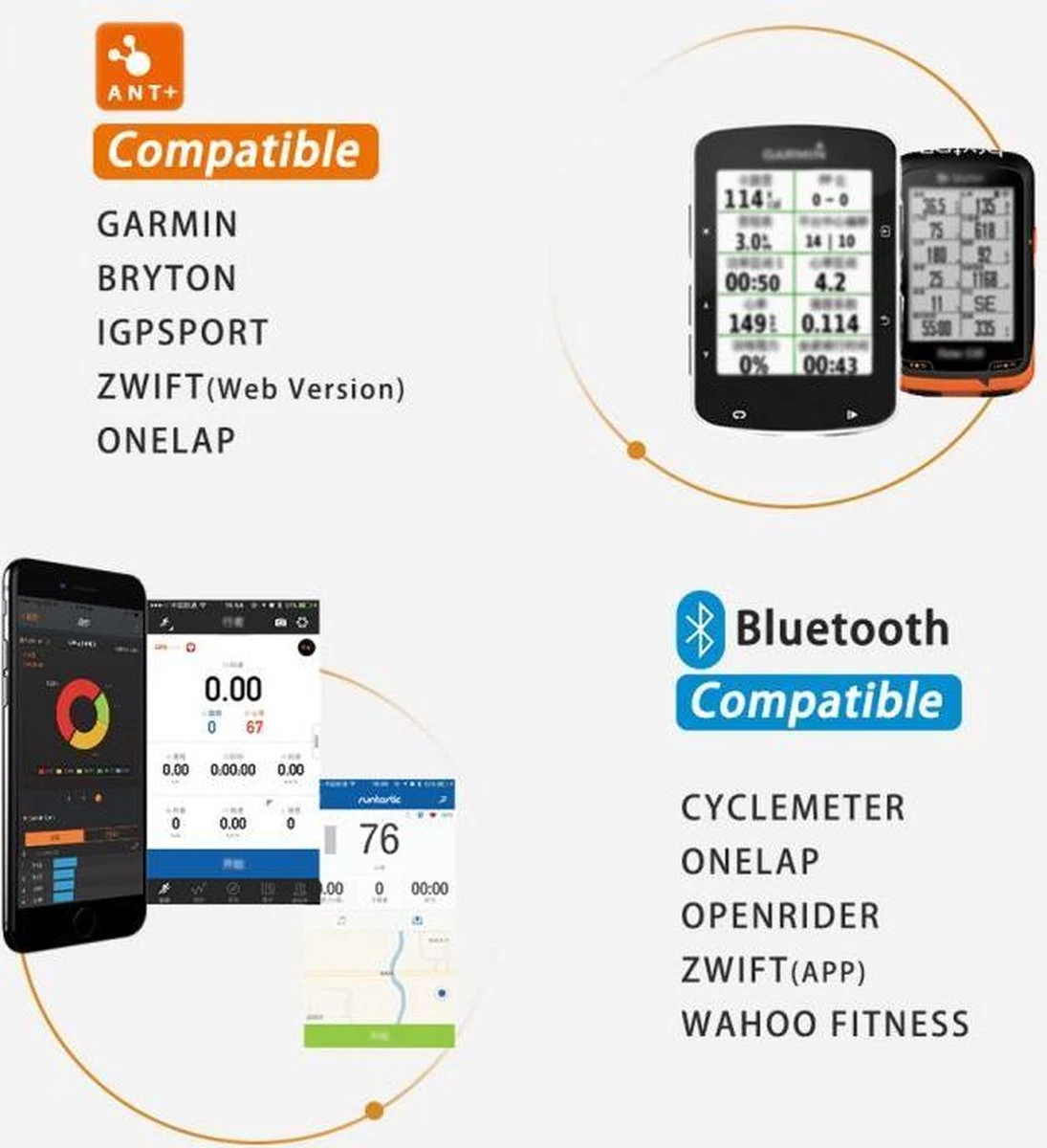 Sensoren intelligente sportapparaten en apps ondersteunen die momenteel op de markt zijn. De ANT + ondersteunt verschillende ANT + fietscomputers, sporthorloges en verschillende pc-trainingssoftware via ANT + adapter. Bluetooth werkt met de standaard app voor bluetooth-snelheids- of cadans, fietscomputers of horloges.