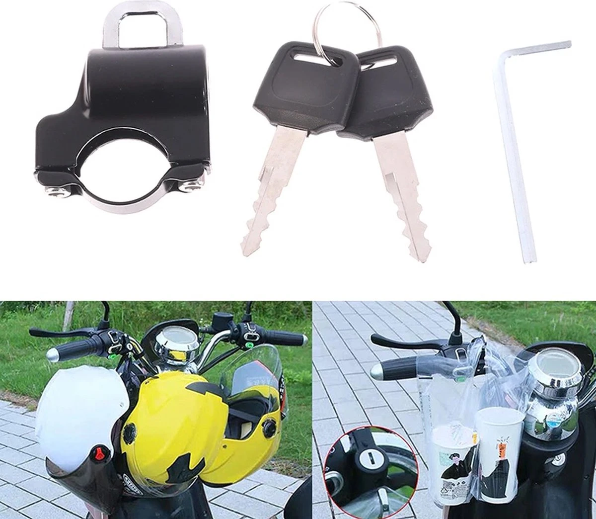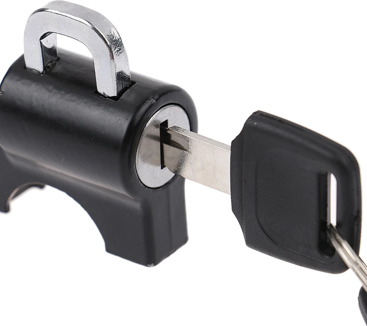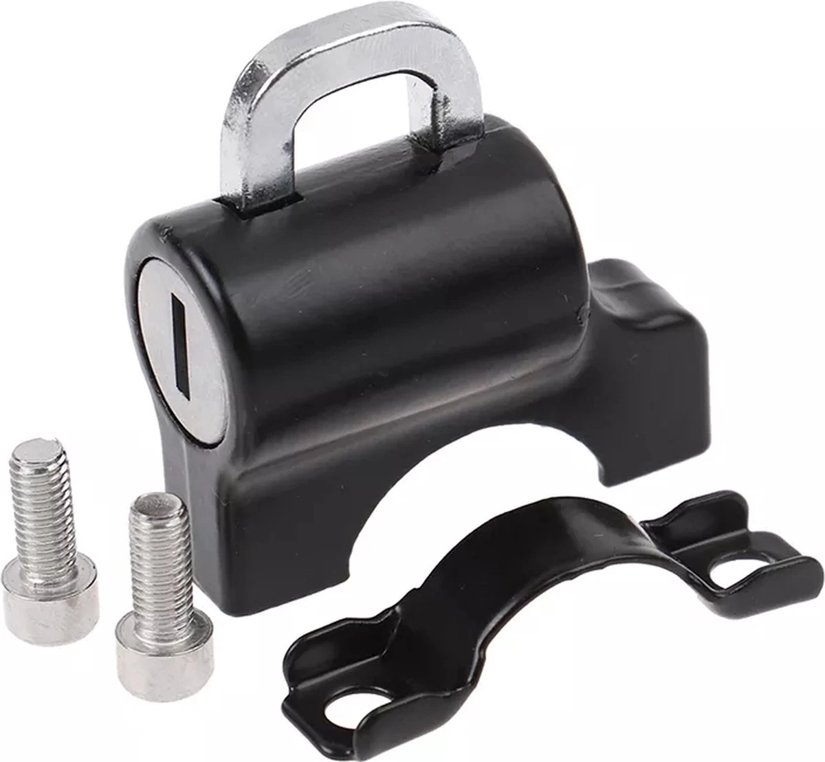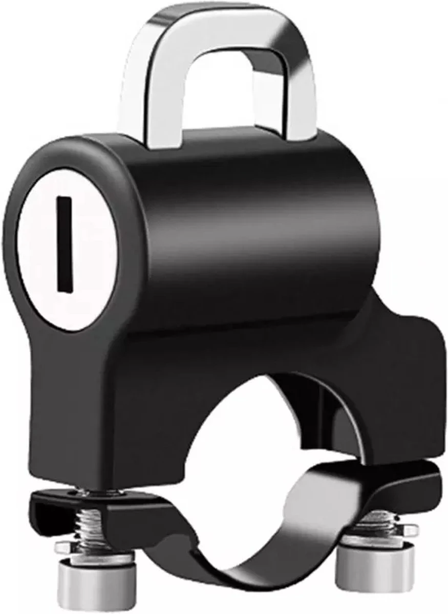 Handig aluminium anti diefstal slot voor je helm. Op eenvoudige wijze te monteren (zie afbeelding). Jouw helm zal vanaf nu niet snel meer gestolen worden.