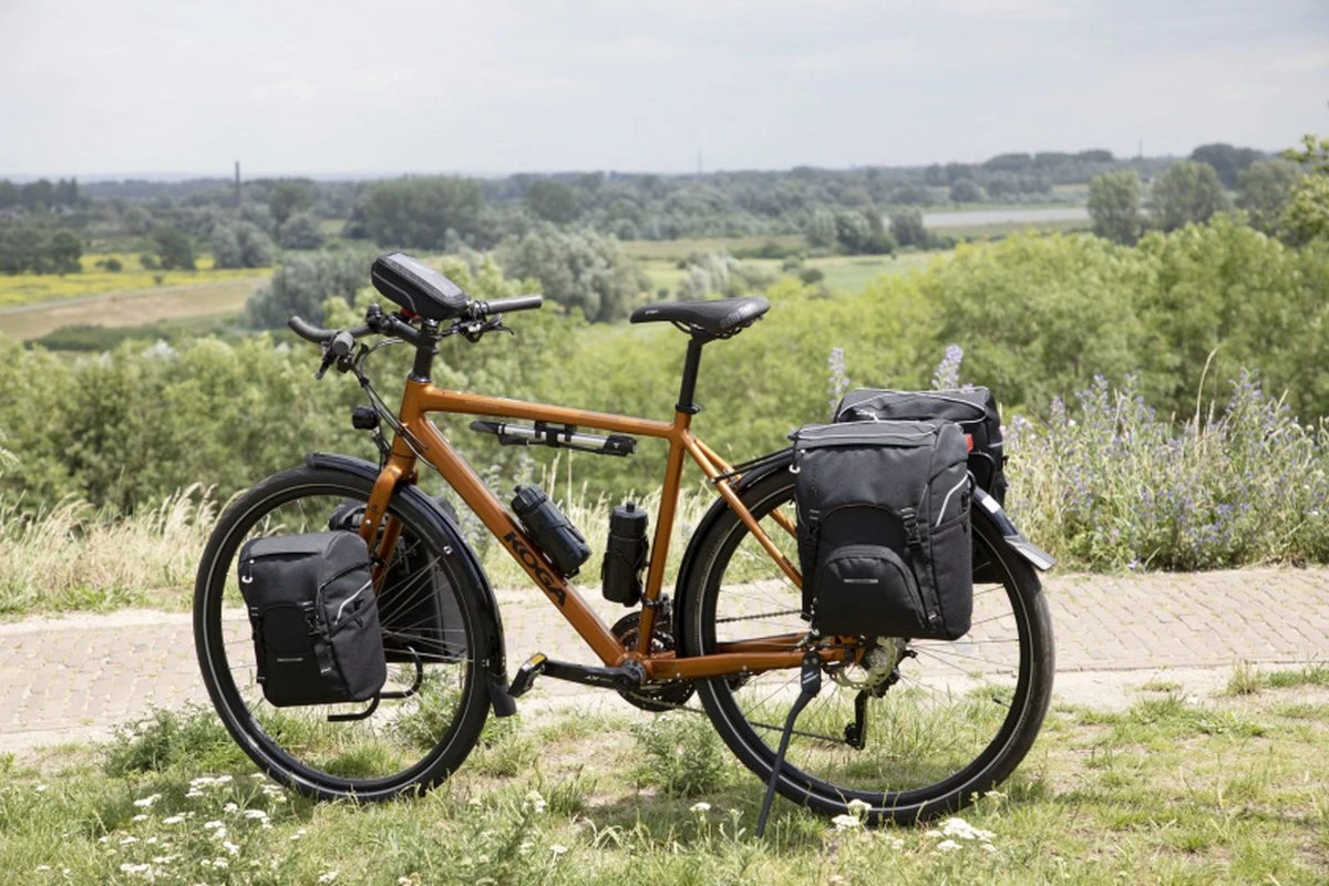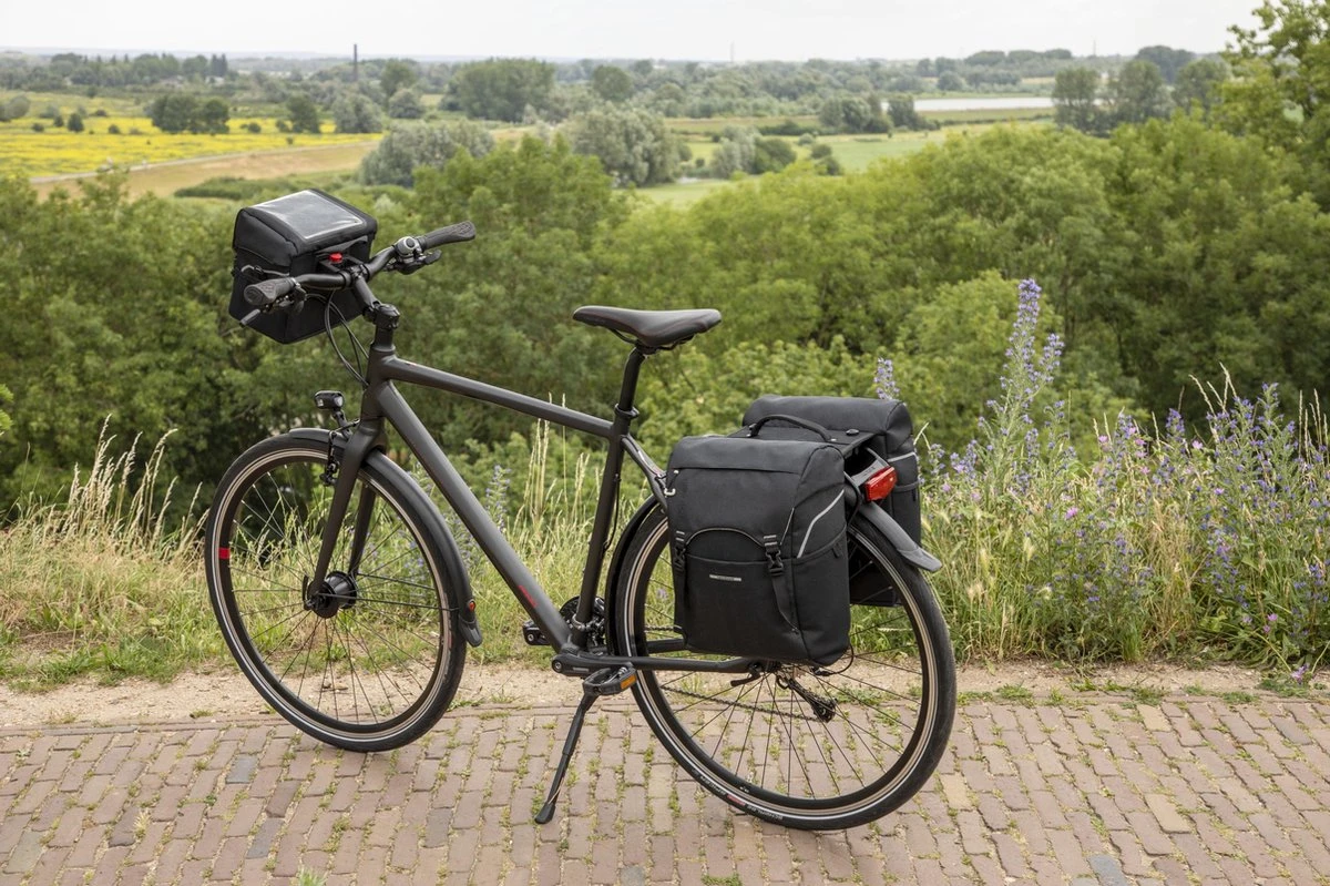 Nooit meer natte spullen met deze dubbele fietstas met regenhoes. Deze dubbele tas past op Racktime bagagedragers.