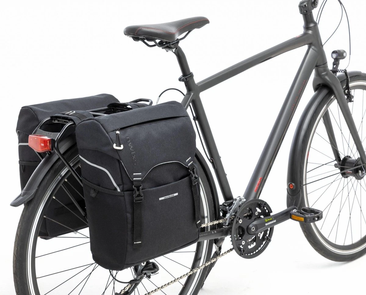 De Sports dubbele tas is ideaal voor een dagje weg. De tas is niet enorm groot maar heeft wel veel extra vakken zodat je alles handig mee kunt nemen. De tas heeft aan 2 kanten een hoofdvak dat je sluit met kliksluitingen. De tas heeft 2 extra voorvakken en 2 elastische zijvakken. Daarnaast zit in de klep van iedere kant een ritsvak. Deze fietstas is daardoor geschikt om boodschappen te gaan doen, naar je werk of school te fietsen of gewoon een recreatief ritje te gaan maken.