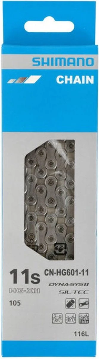 Shimano HG-601 105 / SLX 11 speed Fietsketting De Shimano HG-601 105 / SLX 11 speed Ketting is uitermate geschikt voor racefietsen, mountainbikes, stads/hybride fietsen en elektrische fietsen. Het heeft een uitstekende prijs/kwaliteit verhouding, en de ketting is enorm duurzaam en betrouwbaar. -116 schakels -Lage verzendkosten! De ketting wordt geleverd standaard met ponspen en optioneel KMC Quick link geleverd