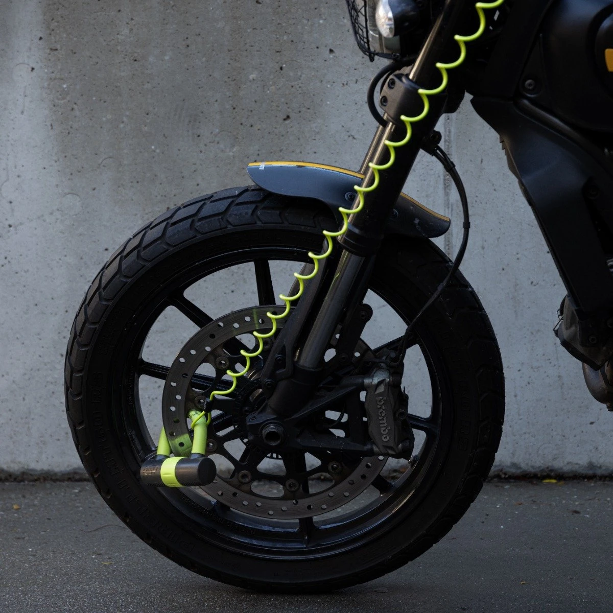 Nooit meer vergeten het slot eerst van het schijfrem te halen, voordat je wegrijdt, met de handige meegeleverde gele reminder kabel.